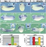 Figure 4. Double depletion of Vent1 and Vent2 causes severe dorsalization of the embryo. (A–D) Injection of either Vent1 or Vent2 MO expands the neural plate at neurula stage (insets), but only the combination of both MOs strongly dorsalizes tailbud stage embryos, with shortened body axes and large heads and cement glands (n=122; Supplementary Table I). (E, F) Vent1/2 depletion leads to transcriptional upregulation of Gsc (hemisections at stage 10; n=15) and Chd (insets in panels E and F; whole embryos, vegetal view; n=18). (G, H) Loss of Gsc increases Vent1 and Vent2 expression (hemisections at stage 10; n=21 and 15) (I) Quantitative RT–PCR analyses showing 3- to 4-fold upregulation of the organizer genes Gsc, Chd, and Admp in animal caps at gastrula stage after Vent1/2 depletion.