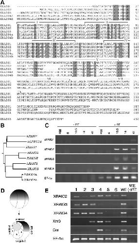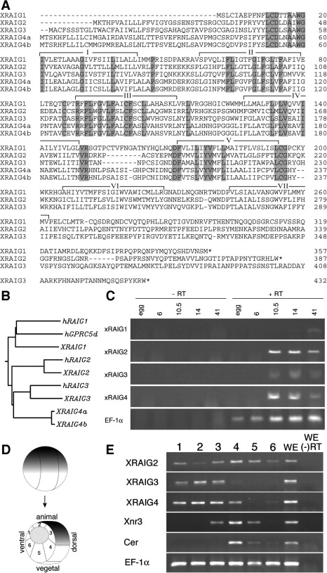 Amino acid sequence of XRAIGs and the expression pattern of XRAIG mRNAs during embryogenesis. (A) Alignment of the predicted amino acid sequence of Xenopus RAIG1, RAIG2, RAIG3, RAIG4a, and RAIG4b. Amino acid residues conserved between all proteins are shaded in black, and putative transmembrane segments are overlined. Only partial sequences of XRAIG4a and XRAIG4b are available from EST databases. (B) Phylogenetic analysis of human and Xenopus RAIGs. The full-length hRAIGs and XRAIG1â3 and the transmembrane domains (IâIV) of XRAIG4a and XRAIG4b were aligned using CLUSTALW with the point accepted mutation (PAM) series substitution matrix. The tree was constructed using CLUSTALW with standard parameters. (C) RT-PCR analysis of XRAIGs during Xenopus development. âRT: without reverse transcriptase. EF-1α was used as an internal control. (D) A schematic diagram shows the dissection of blastula at stage 10.5 into six regions. (E) RT-PCR analysis of XRAIG2, 3, and 4. Xnr3 and Cerberus (Cer) are used as control markers for dissection.