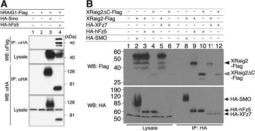 Interaction between Frizzled and RAIG proteins. (A) HEK 293T cells were transiently transfected with plasmids expressing Flag-hRAIG1, HA-Smo, and HA-hFz5 as indicated. The cell lysate was subjected to immunoprecipitation with anti-HA antibody, and the immunocomplex was blotted with anti-Flag antibody (first panel) or anti-HA antibody (third panel). (B) Both blastomeres of two-cell embryos were injected with XRAIG2-Flag mRNA (2 ng), XRAIG2δC-Flag mRNA (2 ng), HA-SMO mRNA (2 ng), HA-hFz5 mRNA (2 ng), or HA-XFz7 mRNA (2 ng) in various combinations as indicated. Extracts were prepared form 20 embryos at stage 9, and subjected to immunoprecipitation with anti-HA antibody. The immunocomplex was blotted with anti-Flag antibody (top panel) or anti-HA antibody (bottom panel).