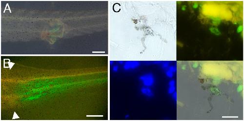 Figure 7. Regeneration of melanophores after skin grafting in tadpoles. (A) A piece of GFP-labelled skin was grafted to the lateral region of the middle trunk of a non-GFP tadpole host, which was then amputated 3 days after. (B) A 7 day tail regenerate from a skin grafted tadpole, white arrowheads indicate the amputation level. (C) Detection of GFP in a melanophore in the regenerate. 4 views are shown: top left transmitted light; top right GFP fluorescence; bottom left DAPI fluorescence (DNA); bottom right transmitted light and fluorescence. Scale bars: 500 μm in A, B, 10 μm in C.