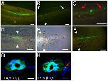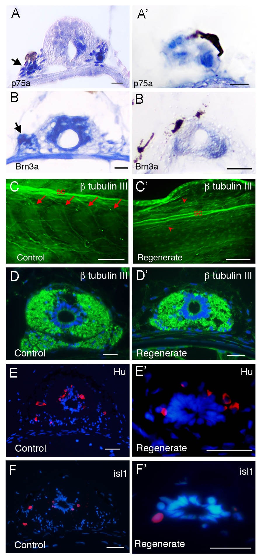 Figure 3. Expression of neural markers in spinal cord of normal and regenerating tails. (A-B') In situ hybridization detection of mRNA expression of p75a (A, A') and Brn3a (B, B') on transverse sections. (A-B) Control tails. (A'-B') Tail regenerates. Arrows in (A, B) indicate ganglia and the arrow in (A') indicates a sporadic ganglion cell. (C-D') β III tubulin expression (green) in whole mount tadpole tails (C, C') and on cross sections (D, D'). (C', D') are one-month regenerates. (E-F') Expression of Hu (E, E') and islet 1 (F, F') are detected by antibody staining on transverse sections. (E, F) un-operated control, (E', F') 2 week old tail regenerates. Scale bars: 250 μm in (E, E'), 20 μm in the rest.