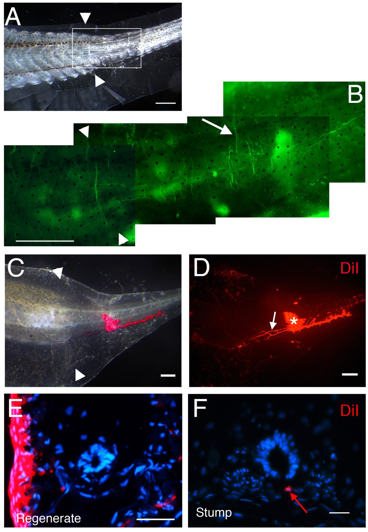 Figure 4. Peripheral nerve fibres in tail regenerates. (A) 1 month old tail regenerate. (B) Neurofilament 200 staining, enlarged view from the section in (A). Arrow indicates a neurofilament 200 positive nerve fibre. (C) Bright field image of a one week old tail regenerate, after DiI injection. (D) Red fluorescent image of (C), * marks the injection site of DiI, white arrow indicates a DiI-labelled nerve fibre. (E, F) The DiI signal is not found in neurons of the regenerating spinal cord (E) but is found in neurons of the proximal stump (red arrow in F). Arrow heads in (A-C) mark the amputation levels. Scale bars: 500 μm in (A-B); 250 μm in (C, D) and 20 μm in (E, F).