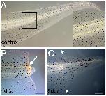 Figure 5. Regeneration of pigmentation in Xenopus tadpoles. (A) Pigment pattern of a stage 49tadpole. The inset is an enlarged view of the amputation level. (B) A regenerating tail 1 day post amputation (dpa). The white arrow indicates the melanophores near the surface. (C) A regenerating tail 5 dpa.