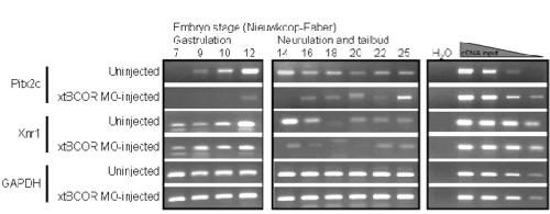 C. Two adjacent, non-overlapping, translation-blocking MOs were designed to target the 5â UTR of xtBcor mRNA. As human anti-BCOR antibodies do not recognize xtBcor (data not shown), blocking of xtBcor mRNA translation was confirmed using an in vitro transcription/translation assay. A 5â fragment of xtBcor mRNA was generated from a PCR template, which included a T7