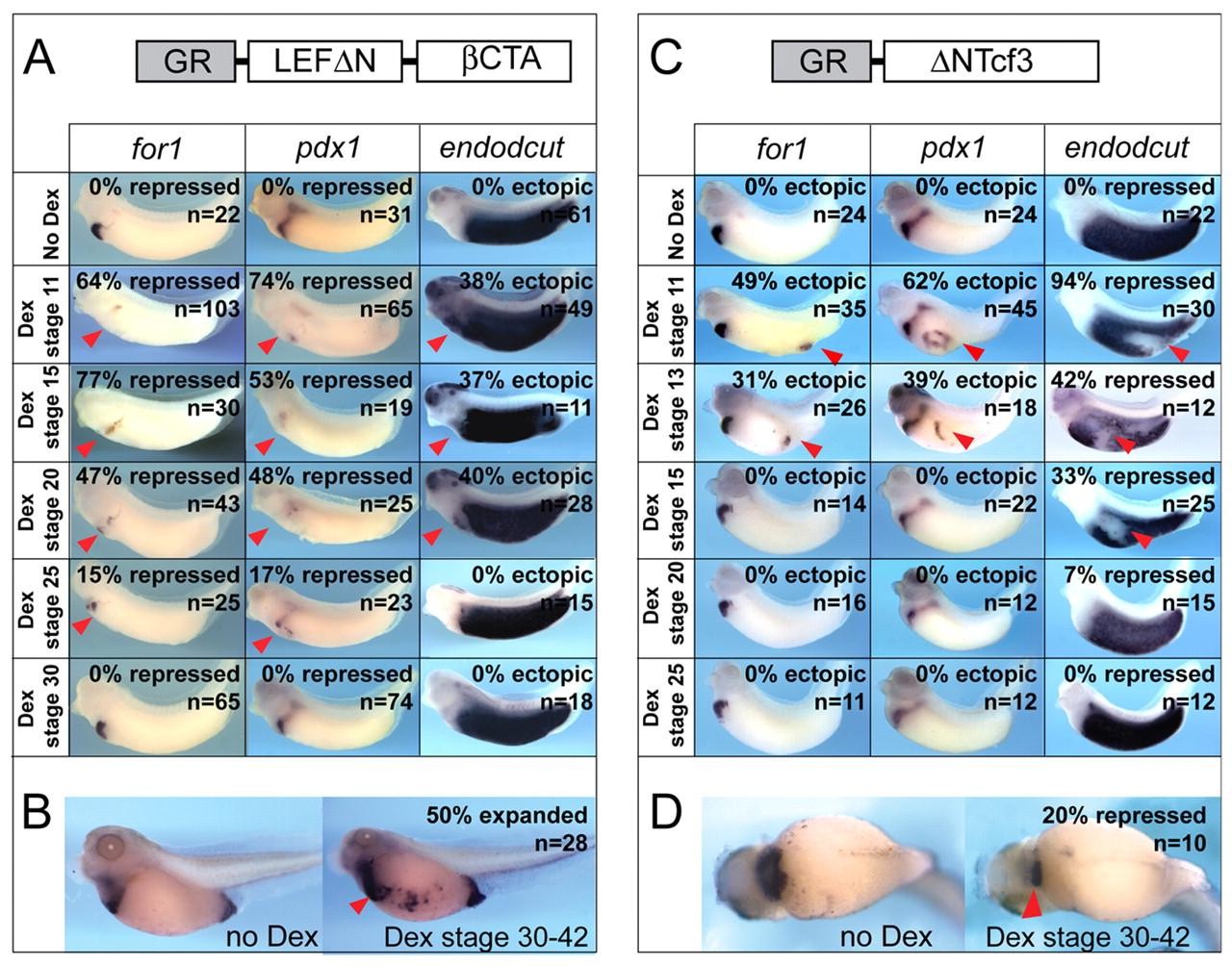 Fig. 2. Temporal regulation of β-catenin/Tcf activity during endoderm pattering. (A) At the 32-cell stage, Xenopus embryos were injected in the anterior D1 cells with RNA encoding the fusion protein GR-LEFδN-βCTA (800 pg), which constitutively activatesβ -catenin target genes in the presence of dexamethasone (Dex). Dex (1μ M) was added to the media of injected embryos at the indicated stages and embryos were assayed by for1, pdx1 and endocut in situ hybridization at stage 35. (B) Addition of Dex to GR-LEFδN-βCTA-injected embryos from stage 30 to 42, followed by hhex in situ, revealed enlarged liver buds. (C) 32-cell stage embryos were injected in posterior D4 cells with RNA encoding GR-δNTcf3 (800 pg), which represses β-catenin/Tcf target genes when activated. Dex (1 μM) was added to the media of injected embryos at the indicated stages and embryos were assayed by for1, pdx1 and endocut in situ hybridization at stage 35. (D) GR-δNTcf3 was injected into D1 cells at the 32-cell stage, and when Dex was added from stages 30 to 42 some embryos exhibited smaller liver buds based on for1 in situ hybridization. No effect was observed in uninjected embryos treated with Dex.
