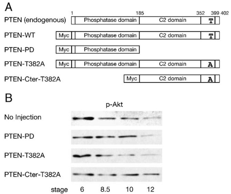 The embryos were injected with mRNA of either PTEN-PD, PTEN-WT, PTENT382A,