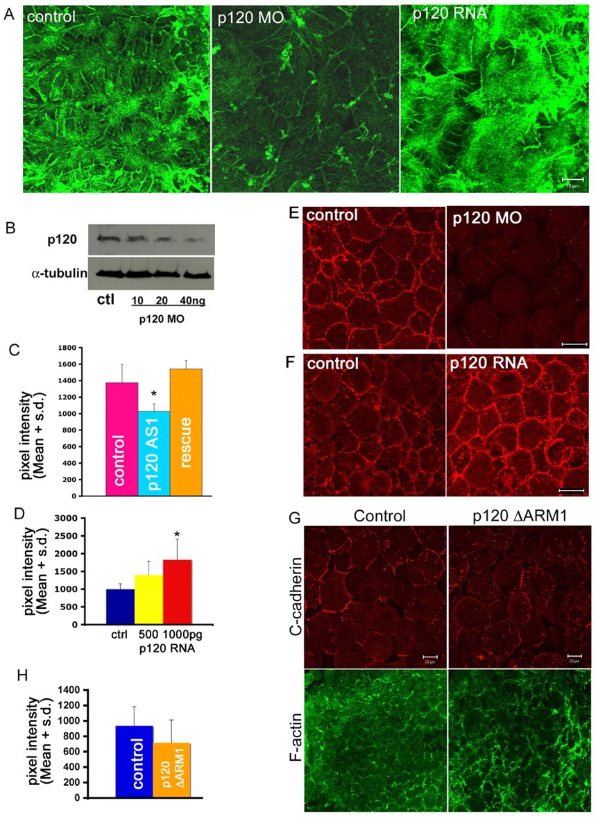 Fig. 5. p120 catenin expression levels control the level of C-cadherin expression at the cell surface and density of the cortical actin skeleton. (A) Representative images of animal caps from Xenopus embryos that were untreated (Control), depleted of p120 (p120 MO), or overexpressing p120 (p120 RNA). (B) Western blot showing the degree to which p120 protein levels are reduced at the blastula stage. (C,D) The changing levels of cortical actin, quantitated by pixel intensity, caused by p120 depletion by an mRNA-targeting antisense deoxynucleiotide oligo (AS1) and rescue by p120 mRNA (C) and increasing doses of p120 mRNA (D). *, P<0.05. (E) Images from C-cadherin-stained animal caps from untreated embryos (control) or p120-depleted embryos (p120 MO). (F) Images from untreated embryos (control) and embryos overexpressing p120 (p120 RNA). Depletion and augmentation of p120 cause decrease and increase in the level of C-cadherin at the cell surface, respectively. (G) A p120 mutant (p120 δArm1) that lacks the C-cadherin-binding domain has no effect on either cadherin or cortical actin levels. C-cadherin (upper panels, samples were fixed with 2%TCA) and actin (lower panels, samples were fixed with FG) staining are shown for animal caps from untreated (left panels) and p120 δArm1-injected embryos (right panels). No increase in C-cadherin or F-actin staining is seen. (H) Overall levels of F-actin caused by p120 δArm1 overexpression quantitated by pixel intensity. Scale bars: 10 μm in A; 20 μm in E-G. |