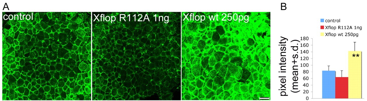 Fig. 7. Overexpression of an Xflop mutant (R112A) that lacks G-protein-coupling activity does not increase cortical actin assembly. (A) Alexa 488-conjugated phalloidin staining showing that overexpression of the R112A mutant (1 ng mRNA injected) does not mimic the capacity of wild-type Xflop to increase cortical actin assembly. (B) Quantitation by pixel intensity shows that R112A had no effect on cortical actin assembly. *, P<0.01. Scale bar: 50 μm. |