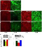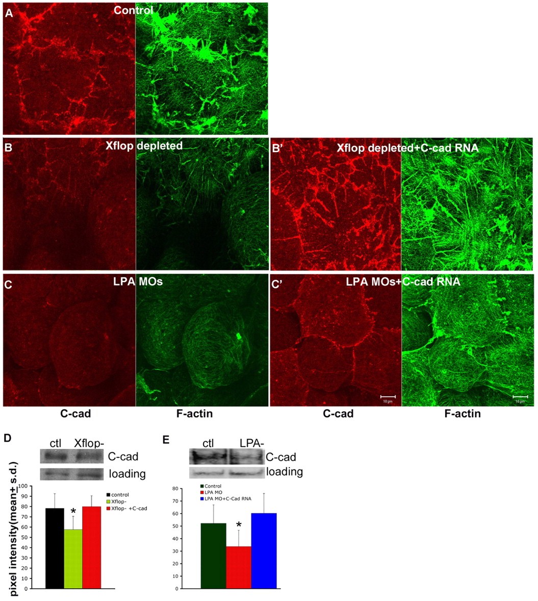 Fig. 8. Depletion of Xflop or LPA receptors causes reduced C-cadherin expression and reduced cortical actin assembly that can be rescued by C-cadherin mRNA. (A-Câ²) Pairs of images (left, C-cadherin staining; right, F-actin staining) from Xenopus embryos that were untreated (A), Xflop-depleted (B), or LPA1 and LPA2-depleted (C). Both cadherin staining and cortical actin assembly are reduced by Xflop and LPA1/2 depletion. The effects of each depletion can be rescued by subsequent injection of C-cadherin mRNA (Bâ²,Câ²). (D,E) Cortical actin levels were quantitated by pixel intensity. *, P<0.01. Insets are western blots showing that depletion of Xflop (D) or LPA1/2 (E) receptors also reduced the total levels of C-cadherin.α tubulin was used as a loading control. Scale bars: 10 μm. |