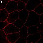 TCA-fixed animal caps were stained with an anti-C-cadherin monoclonal antibody (6B6) and visualized by Cy5-conjugated goat anti-mouse IgG. Shown here is an optical slice of a cleared animal cap imaged by LSM confocal microscope. Positive staining appears along cell-cell contacts as discrete punctae. |