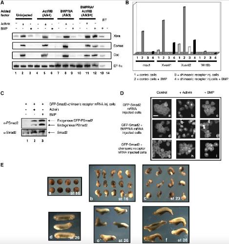 Fig. 6. The cloned chimeric receptor is functional. (A) Induction of early mesodermal markers in chimeric receptor injected animal cap cells. Embryos were injected at the 2-cell stage with 4 ng of mRNA encoding the activin receptor type IB (ActRIB), BMP receptor type IA (BMPRIA) and the chimera BMPRIA/ActRIB. Five animal caps were collected at stage 8.5 and cultured to stage 10 before being treated with 2 μg/ml BMP or 10 ng/ml activin for 20 min; EF1α is the loading control; uninjected, control caps from uninjected embryos. (B) Inhibition of BMP-responsive genes in chimeric receptor injected animal cap cells after BMP4 treatment. Five animal caps from chimeric receptor mRNA injected embryos (bar 4) and five animal caps from control embryos (bar 2) were collected at stage 8.5 and treated with 2 μg/ml BMP for 20 min at stage 10. Five animal caps from chimeric receptor mRNA injected embryos (bar 3) and five animal caps from control embryos (bar 1) were not treated with BMP. RT-PCR was performed to test the expression of msx1, Xvent1, Xvent2 and Wnt8b. (C) GFP-Smad2 is phosphorylated and accumulated in the nucleus in chimeric receptor mRNA injected cells after BMP treatment. Western blot analysis of the phosphorylated form of Smad2 in the chimeric receptor + GFP-Smad2 mRNAs co-injected cells in the presence of BMP. Ten animal caps per lane were loaded and analyzed using an antibody against phospho-Smad2 (α-PSmad2). Both the exogenous and the endogenous forms of Smad2 are detected. Smad2 (α-Smad2) was used as loading control for total protein. (D) Confocal analysis of the GFP-Smad2 nuclear translocation. Two-cell stage embryos were injected at the animal pole with the indicated constructs. The injected animal caps were collected at stage 8, treated for 20 min with 2μg/ml of BMP or 10 ng/ml of activin at stage 10, dissociated and cultured on fibronectin slides. In the unstimulated state GFP-Smad2 was localized in the cytoplasm (panels a, d and g). In the presence of activin, GFP-Smad2 accumulated in the nucleus (panels b, e and h). After BMP treatment only the chimeric receptor + GFP-Smad2 mRNAs co-injected cells showed the nuclear localization of GFP-Smad2 (panel i). Scale bar, 40 μm. (E) Elongation of animal cap explants and double axes in embryos in response to the overexpression of the chimeric receptor. Control animal caps (panels a) and 0.8 ng chimeric receptor mRNA injected caps (panels b and c) were collected at stage 8 and cultured in 1X MBS until the stages shown. Control embryos (panel d) and 0.8 ng chimeric receptor mRNA ventrally injected embryos at the 4-cell stage (panels e) and at the 16-cell stage (panel f) were cultured until stage 26 and analyzed for the presence of a double axis. The presence of endogenous BMP is sufficient to induce elongation in explanted animal caps and full (panel e) or partial (panel f) double axes in embryos. |