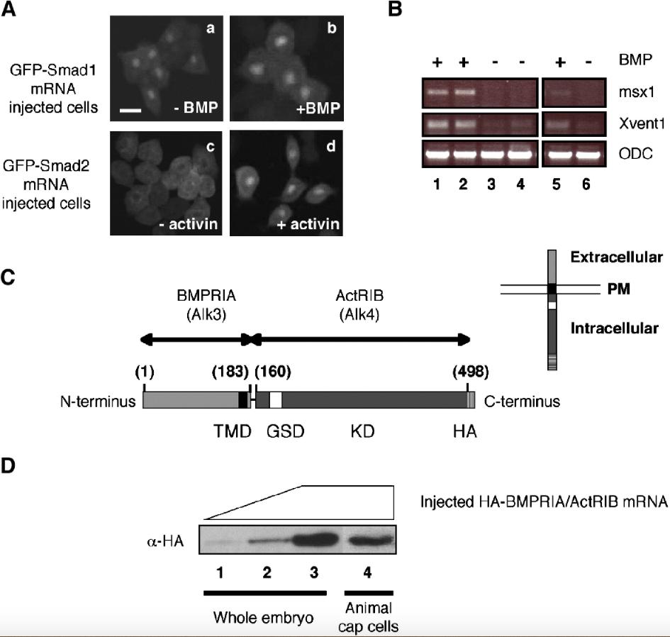 Fig. 5. GFP-Smad1 is localized in both nucleus and cytoplasm in the absence of BMP. Distribution of GFP-Smad1 in Xenopus animal cap cells. (A) 0.2 ng of GFP-Smad1 mRNA was injected in embryos at the 2-cell stage. Animal cap cells were isolated at stage 8 and cultured on a fibronectin slide with (panel b) or without 2 μg/ml of BMP4 (panel a). In comparison, panels c and d show animal cap cells injected with 0.2 ng GFP-Smad2 mRNA in the absence and in the presence of 10 ng/ml activin, respectively. Scale bar, 20 μm (B) Nuclear GFP-Smad1 does not activate gene response. Five animal caps from injected GFP-Smad1 embryos (lanes 1 to 4) and from control embryos (lanes 5 and 6) were analyzed by RT-PCR to test the expression of msx1 and Xvent1 in the absence and in the presence of BMP treatment. ODC represents the loading control. Samples 1 and 2 are duplicates as well as samples 3 and 4. (C) Cloning and expression of BMPRIA-ActRIB (Alk3-4). Schematic representation of the cloned chimeric receptor. BMPRIA-ActRIB (Alk3-4) is composed of the extracellular and transmembrane domains of Xenopus BMPRIA (Alk3) and the intracellular domain of ActRIB (Alk4). The HA epitope tag has been cloned in frame with the receptor's sequence. TMD, transmembrane domain; GSD, GS domain; KD, kinase domain; HA, influenza virus hemagglutinin epitope tag; (number), amino acids corresponding to the BMPRIA and ActRIB sequences used for cloning. (D) Western blot analysis of the chimeric receptor (BMPRIA/ActRIB) protein in whole embryos and in animal cap cells at stage 11. Embryos were injected at the 2-cell stage with 1.0 ng (lane 1), 2.0 (lane 2) and 4.0 ng (lanes 3 and 4) of chimeric receptor mRNA. 10 Animal caps (lane 4) and two whole embryos (lanes 1â3) were loaded in each lane and subjected to Western blot analysis with anti-HA antibody (α-HA). |