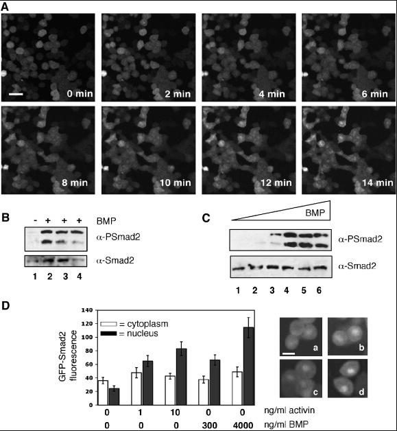 Fig. 7. The chimeric receptor can detect in real-time the presence of BMP. (A) Confocal time course analysis of dissociated animal cap cells from chimeric receptor + GFP-Smad2 co-injected embryos after BMP treatment. Animal cap cells were treated directly at the confocal with 2 μg/ml of BMP4 at stage 8 and immediately analyzed. Pictures were taken every 2 min. Scale bar, 40 μm. (B) Western blot analysis of animal caps from embryos co-injected with GFP-Smad2 + chimeric receptor mRNAs. Ten animal caps were loaded in each lane and treated with 2 μg/ml of BMP for 10 min. Samples were frozen 1 h (lane 2), 2 h (lane 3) and 4 h (lane 4) after BMP treatment. Anti-phospho-Smad2 antibody recognizes both the exogenous GFP-Smad2 (upper bands) and endogenous form of Smad2 (lower bands). (C) Increasing concentrations of BMP ligand induced an increased amount of phosphorylated GFP-Smad2. Animal cap cells from chimeric receptor + GFP-Smad2 co-injected embryos were treated with 0, 50, 100, 600,1200 and 4000 ng/ml of BMP4. Activation of Smad2 was visualized by Western blot using anti-phospho-Smad2 antibody (α-PSmad2). The total amount of Smad2 protein has been visualized using anti-Smad2 antibody (α-Smad2). (D) Dissociated animal cap cells from chimeric receptor + GFP-Smad2 mRNAs co-injected embryos were cultured on fibronectin coated slides and treated with the indicated amount of BMP for 20 min. GFP-Smad2 dissociated animal cap cells were also treated with activin for the same length of time. Cells were then washed and analyzed by confocal microscopy. The intensity of the nuclear GFP-Smad2 fluorescence (black bars) and cytoplasmic GFP-Smad2 fluorescence (white bars) have been measured by arbitrary units using the âLaser Sharpâ program and represented as bars in the graphic (left panel). Each bar represents the mean value ± SD of the intensity of nuclear GFP in about 100 cells analyzed from two independent experiments. Representative group of cells for each experiment is shown (right panels). Scale bar, 20 μm. |