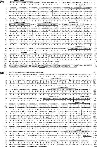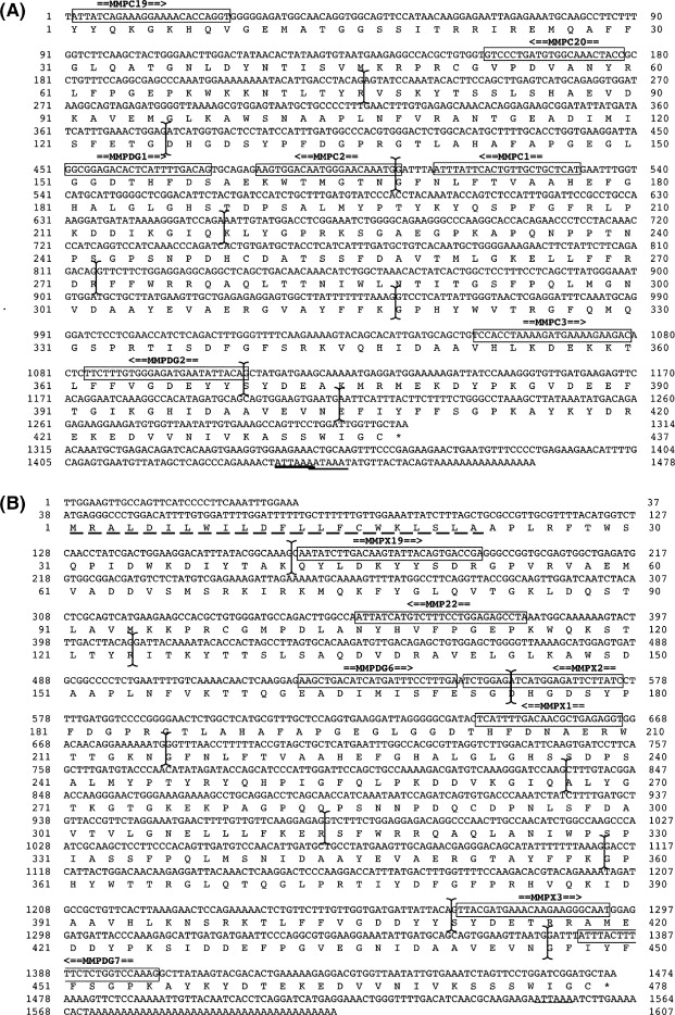 (A) Nucleotide and translated amino acid sequences of caiman MMP20 cDNA clone. Amino acid residues are shown with the IUPAC-IUB single letter code. The stop codon is indicated by an asterisk (⁎) and the polyadenylation signals are underlined with a solid line. Primer positions and orientations are indicated by double lines with arrowheads above their boxed locations in the sequence. Vertical lines show the positions of the exon boundaries. The sequences can be accessed in the GenBank database under accession no. DQ885891. (B) Nucleotide and translated amino acid sequences of toad MMP20 cDNA clone. The signal peptide is underlined with a dotted line. Other indicators are the same as in A. The sequences can be accessed in the GenBank database under accession no. DQ885892.