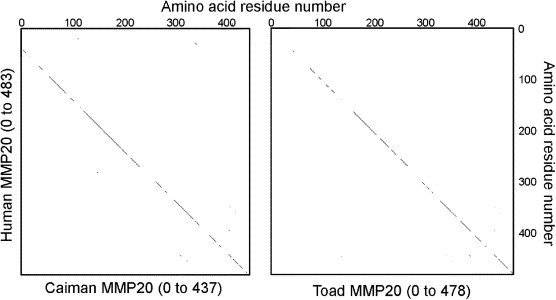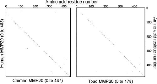Dot-plots of caiman and toad amino acid sequences (abscissa), as compared to the human MMP20 sequence (ordinate). A single dot indicates 5 matching residues in a size 7 window.