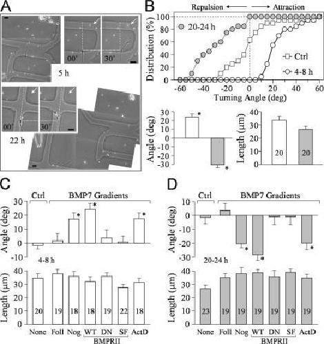 Figure 2. Double turning responses of the same growth cone at different times and the involvement of BMP receptors. (A) Representative images showing the turning responses of the same Xenopus growth cone at 5 (paired panels on the top right) and 22 h (paired panels at the center left) after plating (5 μM BMP7 in pipette). Dotted lines indicate the corresponding positions of the growth cone at the onset of the turning assay, dashed lines indicate the original directions of growth cone extension, and arrows point to the BMP7 gradient. Irregular-shaped low magnification images were stitched together to show the cell body, its neurites, and its location on the grid. (B) Quantitative analysis of the turning responses from 20 growth cones subjected to the double turning assay. The cumulative histogram in the top panel shows the distribution of the turning angles for these growth cones. Each point represents the percentage of growth cones with final turning angles equal to or less than the values indicated on the abscissa. The control curve is from the 6-h group shown in Fig. 1. The mean turning angles and lengths of growth cone extension from these 20 growth cones are shown in the bottom panel. (C and D) BMPRII mediates BMP7 attraction in 4–8-h cultures (C) and repulsion in overnight cultures (D). The mean turning angles (top) and lengths of growth cone extension (bottom) are shown in the bar graphs. The number of growth cones examined in each group is indicated in the length bar graphs. Asterisks indicate significant differences compared with the corresponding control (*, P < 0.05; Mann-Whitney test). Ctrl, control; Foll, follistatin; Nog, noggin; WT, wild type; DN, dominant negative; SF, short form; ActD, actinomycin D. Error bars represent SEM. Bars, 20 μm. |