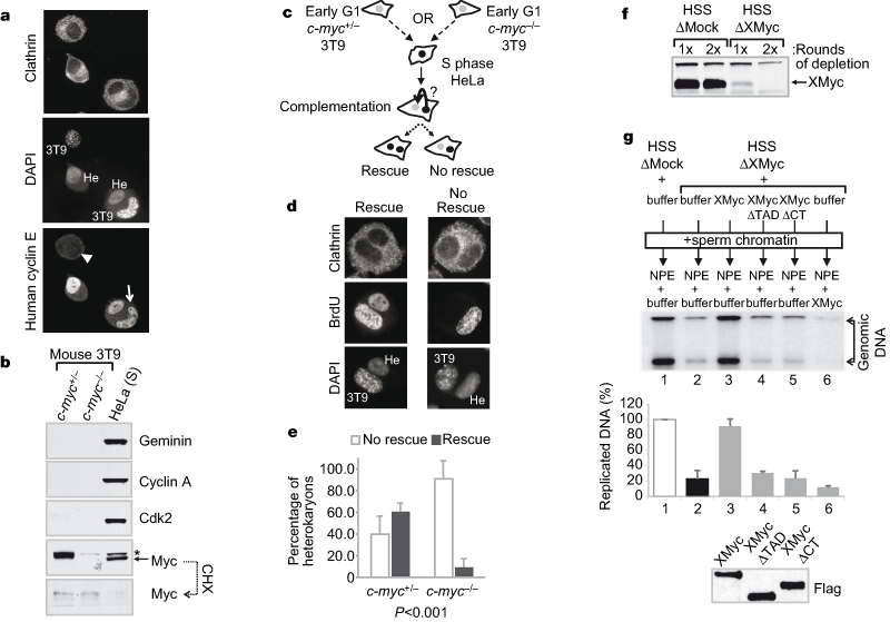 Figure 3: Myc is required for efficient DNA replication and proper origin specification in the absence of transcription. a, Cyclin/Cdk shuttles within human/mouse heterokaryons. Isolated heterokaryons were stained with a human-specific antibody against cyclin E. Arrow, 3T9 mouse nuclei within the heterokaryons uptaking cyclin E; arrowhead, isolated 3T9 cells, devoid of cyclin E. Mouse (3T9) and human (He) nuclei exhibit distinct 4,6-diamidino-2-phenylindole (DAPI) staining patterns. b, Western blot analysis of selected proteins in whole-cell lysates from the indicated cells before cell fusion. CHX, cycloheximide; asterisk, nonspecific band in HeLa cells. c, Experimental scheme for the cell fusion experiments (see also Supplementary Information). d, Representative images of heterokaryons identified in the screen for replication rescue, summarized in e. e, Average of cell fusion experiments. More than 70 heterokaryons were counted and classified according to the patterns shown in d. The P value (χ2 analysis) is shown below. Error bars indicate s.d. f, Western blot analysis of mock- or XMyc-depleted Xenopus cell-free extracts. g, Replication assay in the Xenopus HSS/NPE system. Genomic DNA was extracted at 90 min and incorporated 32P was quantified by PhosphorImager. Recombinant XMyc proteins (50 nM) were added to XMyc-depleted HSS extracts (lanes 3–5) or to NPE (lane 6) as indicated. A representative autoradiograph is shown. An average of three experiments is shown in the graph below. Error bars indicate s.d. Bottom panel: western blot analysis of recombinant XMyc protein levels.