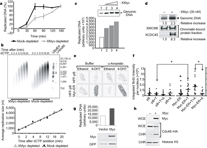 FIGURE 4. Relationship between Myc protein levels and the number of active DNA replication origins. a, Replication reactions in mock- and XMyc-depleted Xenopus cell-free extracts were stopped at the indicated time points and quantified. An average of three experiments is shown (plusminuss.d.). b, Electrophoretic analysis of nascent replication products on Ara-C-induced synchronization of depleted Xenopus extracts (top panel). Bottom panel: average size of replication products plotted over time to indicate elongation rates (best-fit curves). dCTP, deoxy-cytidine triphosphate. c, Replication reactions in Xenopus extracts, supplemented with increasing amounts of XMyc, were stopped at 60 min and analysed. d, Top panel: replication reactions in Xenopus extracts assembled in the presence or absence of XMyc and analysed after 40 min. Bottom panel: western blot analysis of corresponding chromatin fractions. Chromatin-bound Xenopus Cdc45 was quantified using Scion software and normalized to Xenopus MCM6. e, Analysis of BrdU foci unclear distribution in synchronized WI38 fibroblasts (Myc-ER or empty vector). alpha-Amanitin (2 mug ml-1) or buffer was added 30 min before tamoxifen (4-OHT) exposure and BrdU labelling (see scheme in Supplementary Fig. 10). f, Quantification of the experiment shown in e. Nuclear BrdU intensity is the sum of all BrdU spots. The threshold is set above 3 s.d. from background. Asterisk, P < 0.05, based on a two-sided Student's t-test. Each dot is the sum intensity of one cell. pB, empty vector; T, tamoxifen; A, alpha-amanitin. g, Transiently transfected H1299 cells (GFP with or without c-Myc cDNA), synchronized in G1/S and released to S phase in the presence of 32P orthophosphate. After 3 h, DNA was isolated and incorporated nucleotides quantified by scintillation counting. Bottom panel: western blot analysis of whole-cell lysates from the same cells. h, H1299 cells were co-transfected with an HA-tagged Cdc45 cDNA and empty vector or c-Myc cDNA. On synchronization, cells were collected in S phase and chromatin fractions (CHR) or whole-cell extracts (WCE) resolved by SDS–PAGE and analysed by western blot.