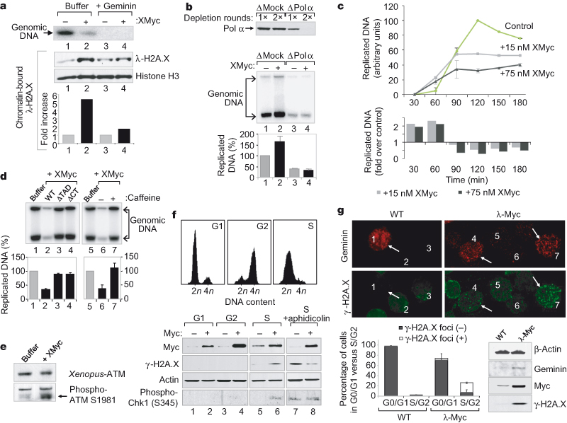 FIGURE 5. Myc deregulation induces replication-dependent DNA damage. a, Replication reactions in Xenopus extracts, assembled in the presence or absence of XMyc (75 nM) and geminin, were stopped at 120 min (top panel). Middle panel: western blot analysis of chromatin fractions. Chromatin-bound gamma-H2A.X was quantified by Scion software and normalized to histone H3 (graph). b, Immunodepletion of DNA polymerase alpha (Pol alpha) from Xenopus extracts (top panel). Replication reactions were then assembled with buffer or XMyc (30 nM) (middle panel) and quantified. The graph shows an average of three experiments (plusminuss.d.). c, Replication reactions assembled in Xenopus extracts in the presence or absence of XMyc. Samples taken at indicated time points were quantified (average of two experiments, plusminuss.d.; top graph). The bottom graph shows fold change between control (set at 1) and XMyc-treated extracts. d, Replication reactions in Xenopus extracts performed in the presence or absence of XMyc (wild type (WT) and mutants, 75 nM, lanes 1–4), or 5 mM caffeine (lanes 5–7). Reactions were analysed after 120 min. The graph shows the average of three experiments (plusminuss.d.). e, Western blot analysis of cytosolic fractions from replication reactions performed in the presence or absence of XMyc for 20 min, and probed with phospho-specific anti-ATM antibodies. f, Mammalian U2OS cells transfected with Myc and synchronized by nocodazole (G1, G2) or thymidine (S) blocks. Where indicated, aphidicolin (2.5 muM) was added to prevent S-phase entry. FACS profiles depict cell cycle status at collection. Bottom panel: western blot analysis of whole-cell lysates. g, Analysis of gamma-H2A.X distribution in splenic B cells from lambda-Myc mice and wild-type littermates. Top panel: immunofluorescence analysis for geminin and gamma-H2A.X distribution. Numbers identify cells within the images; arrows indicate cells with nuclear geminin (S/G2). The graph shows cell cycle distribution (based on geminin staining) and quantification of cells with nuclear gamma-H2A.X foci within these subpopulations (average of two experiments (plusminuss.d.), n > 1,000). A western blot analysis on whole-cell lysates from both B-cell populations is shown (bottom right panel).