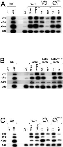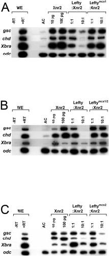 Figure 2. Inhibition of Xnr2 by XleftyL. A: One-cell stage embryos were injected with RNA (pg/embryo indicated) encoding Xnr2 plus or minus Xlefty or Xleftymcs1, the latter to enforce XleftyS production. Animal caps were analyzed at stage 10.5 for organizer-specific (goosecoid and chordin) or pan-mesodermal markers (Xbra). Odc, loading control. B,C: Similar analysis of one-cell stage embryos overexpressing uncleavable Xlefty proprotein (B, Xleftymcs1/2 RNA used) or proprotein that enforces XleftyL production (C, from Xleftymcs2 RNA) on Xnr2-mediated mesoderm induction. WE, whole embryo plus (+) and minus (â) reverse transcriptase (RT); AC, uninjected animal cap; 1:1, 10 pg of each RNA; 10:1, 100 pg of RNA encoding Xlefty or cleavage mutant protein, and 10 pg of Xnr2 RNA.Download figure to PowerPoint