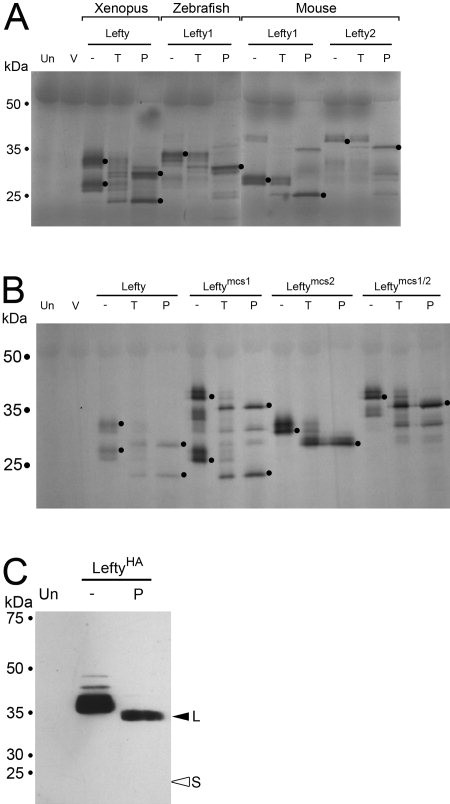 Figure 1. Glycosylation of Lefty molecules. A,B: Medium was analyzed from Xenopus oocytes injected with the indicated RNAs, metabolically labeled with [35S]-methionine/cysteine. Black dots, major glycosylated and deglycosylated bands. C: Western blot of conditioned medium from dissociated animal halves isolated from embryos injected at the one-cell stage with 2.5 ng of XleftyHA RNA. Un, uninjected oocytes or embryos; V, vehicle (1% DMSO); (â), oocytes not injected with tunicamycin, or conditioned medium not treated with PNGase F; T, tunicamycin; P, PNGase F; L, XleftyL (filled arrowhead); S, XleftyS (open arrowhead).Download figure to PowerPoint