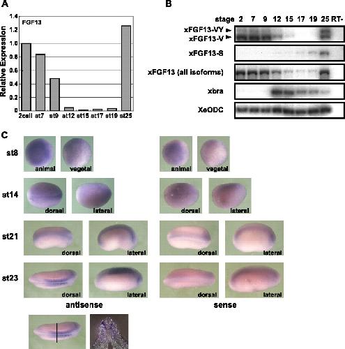 Expression pattern of xFGF13.A, total RNA was isolated from embryos at the indicated stages, and expression of xFGF13 was analyzed by real time PCR. B, expression of each isoform of xFGF13 was analyzed by semiquantitative RT-PCR. XeODC was used as an RNA loading control. Xbra was also examined. C, whole-mount in situ hybridization against xFGF13 at the indicated stages.