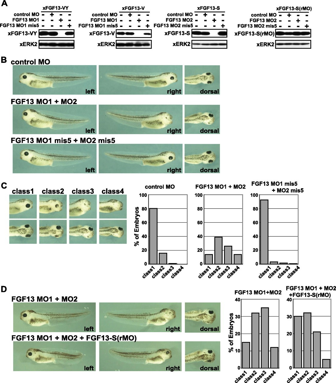 FGF13 is required for head development.A, indicated sets of morpholino-oligonucleotides (30 ng) and mRNA (0.8 ng) were injected, and the protein level was examined by immunoblotting with anti-Myc antibody. We used xERK2 as a loading control. B, control MO (30 ng), FGF13 MO1 (15 ng) plus MO2 (15 ng), or FGF13 MO1 mis5 (15 ng) plus MO2 mis5 (15 ng) were injected into the dorsal animal hemisphere on the right side at the four-cell stage. C, embryos injected with MOs were classified into four groups according to the eye size: class 1, normal or only slightly smaller; class 2, smaller; class 3, much smaller; class 4, none. About 80% of embryos injected with FGF13 MO1 plus MO2 (n = 108) showed definite defects in eyes, whereas only 20% of embryos injected with control MO (n = 101) and 6% of embryos injected with FGF13 MO1 mis5 plus MO2 mis5 (n = 118) showed defects. D, xFGF13-S (rMO) mRNA (3.2 ng) was co-injected with FGF13 MO1 plus MO2 for the rescue experiment. 58% of embryos co-injected with xFGF13-S (rMO) mRNA showed defects (n = 102), whereas 79% of embryos injected with FGF13 MO1 plus MO2 showed defects (n = 170) (p < 0.001 by Mann-Whitney test).