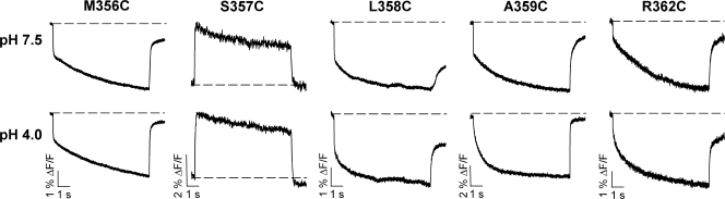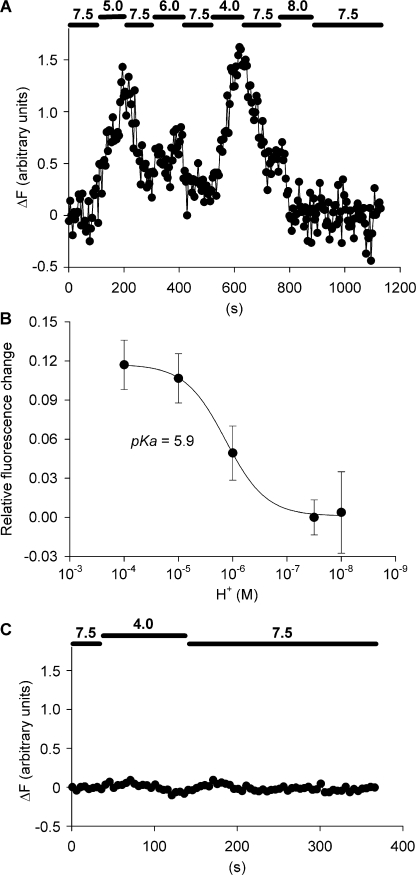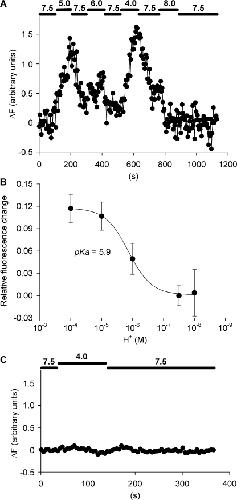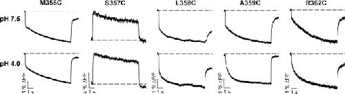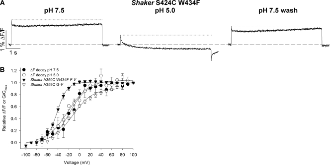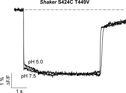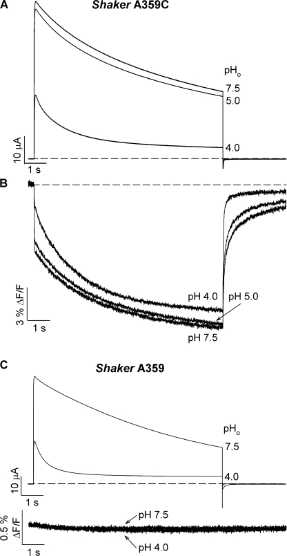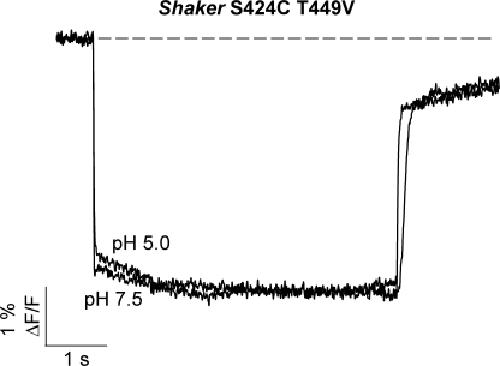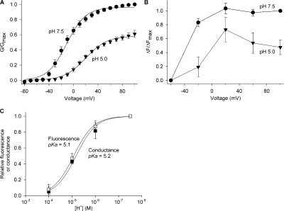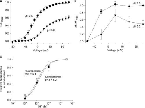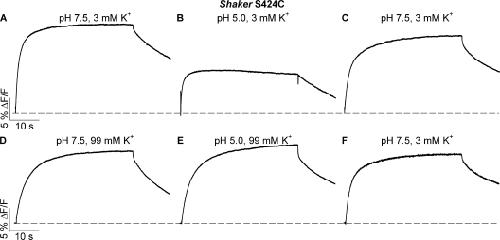 Lowering external pH reduces peak current and enhances current decay in Kv and Shaker-IR channels. Using voltage-clamp fluorimetry we directly determined the fate of Shaker-IR channels at low pH by measuring fluorescence emission from tetramethylrhodamine-5-maleimide attached to substituted cysteine residues in the voltage sensor domain (M356C to R362C) or S5-P linker (S424C). One aspect of the distal S3-S4 linker alpha-helix (A359C and R362C) reported a pH-induced acceleration of the slow phase of fluorescence quenching that represents P/C-type inactivation, but neither site reported a change in the total charge movement at low pH. Shaker S424C fluorescence demonstrated slow unquenching that also reflects channel inactivation and this too was accelerated at low pH. In addition, however, acidic pH caused a reversible loss of the fluorescence signal (pKa = 5.1) that paralleled the reduction of peak current amplitude (pKa = 5.2). Protons decreased single channel open probability, suggesting that the loss of fluorescence at low pH reflects a decreased channel availability that is responsible for the reduced macroscopic conductance. Inhibition of inactivation in Shaker S424C (by raising external K(+) or the mutation T449V) prevented fluorescence loss at low pH, and the fluorescence report from closed Shaker ILT S424C channels implied that protons stabilized a W434F-like inactivated state. Furthermore, acidic pH changed the fluorescence amplitude (pKa = 5.9) in channels held continuously at -80 mV. This suggests that low pH stabilizes closed-inactivated states. Thus, fluorescence experiments suggest the major mechanism of pH-induced peak current reduction is inactivation of channels from closed states from which they can activate, but not open; this occurs in addition to acceleration of P/C-type inactivation from the open state.