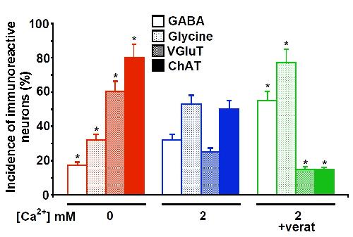 Fig. 8. Neurotransmitter expression in neurons cocultured with muscle cells is homeostatically regulated by neuronal Ca2+ spike activity. Nerve-muscle cocultures were grown in Ca2+-free, 2 mM Ca2+, or 2 mM Ca2+ plus 1 μM veratridine medium to alter neuronal Ca2+ spike activity. Cultures were fixed at 18 h and processed for immunocytochemistry. Values are mean± SEM for >40 neurons from five independent cultures for each group. *, P < 0.01 when compared to the 2 mM Ca2+ condition. |