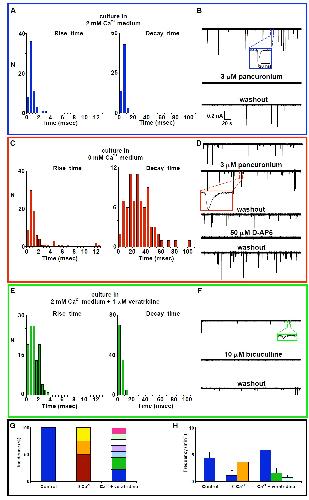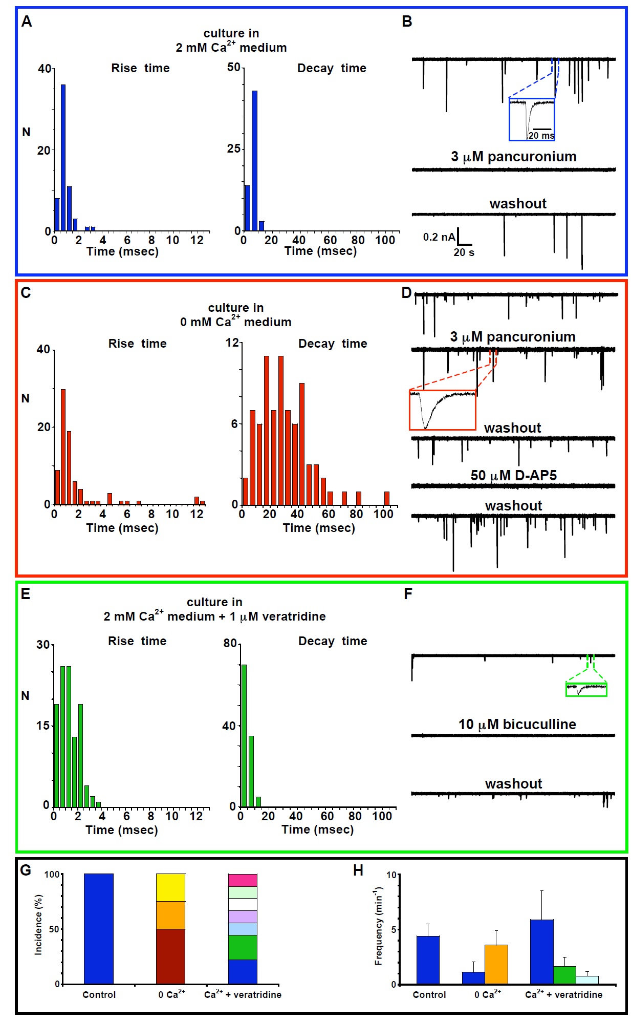 Fig. 9. Neuromuscular junctions formed in vitro are mediated by cholinergic and noncholinergic pairs of neurotransmitters and neurotransmitter receptors. Whole-cell recordings from innervated muscle cells were performed at 15-24 h in vitro in the presence of 2 mM Ca2+, Mg2+-free saline, and 3 μM TTX with Vh = -80 mV. (A, C, and E) Kinetic analysis of mpscs recorded from cells grown in Ca2+-free, 2 mM Ca2+, or 2 mM Ca2+ plus 1 μM veratridine medium. Only mpscs with decay times fit by single exponentials are included. (B, D, and F) Examples of recordings from neuromuscular junctions mediated by different transmitters and transmitter receptors. (G) Incidence of cholinergic, glutamatergic, GABAergic, and glycinergic neuromuscular junctions. Bars represent the percent of each class of neuromuscular junction. (H) Frequencies of mpscs. Values are mean ± SEM. (G and H) Blockers used to identify receptors: pancuronium (nAChR), kynurenate (iGluR), D-AP5 (NMDAR), bicuculline (GABAAR), and strychnine (GlyR). Blue, cholinergic; brown, glutamatergic; orange, NMDAergic; yellow, cholinergic plus NMDAergic; green, glycinergic; light-blue, GABAergic; purple, cholinergic plus GABAergic; white, GABAergic plus glycinergic; light green, cholinergic plus glycinergic; pink, cholinergic plus GABAergic plus glycinergic. Values are from three control (2 mM Ca2+ medium), four spike-suppressed (Ca2+-free medium), and nine spike-enhanced (Ca2+ plus veratridine medium) neuromuscular junctions. |