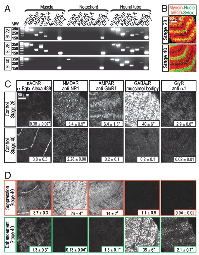 Fig. 1. Expression of nAChR, NMDAR, AMPAR, GABAAR, and GlyR transcripts and protein in skeletal muscle during normal development and after alterations in neuronal activity. (A) RT-PCR was used for detection of subunit transcripts of five neurotransmitter receptors in muscle, notochord, and neural tube at three stages of development. Tissue-specific RNA was analyzed from embryos at 1 day (stage 22, Top) and 1.3 days (stage 28, Middle) and from larvae at 3 days (stage 40, Bottom). Primers were designed from predicted Xenopus sequences for nAChR1, NR1, GluR1, GABAAR2, and GlyR1 subunits and for neuronal markers NeuroD and neurogenin-related protein 1 (NGNR-1). (B and C) Multiple classes of transmitter receptors are expressed in embryonic skeletal muscle in vivo. Whole mounts from 1.3-day (stage 28) embryos and 3-day (stage 40) larvae were labeled for myosin and nuclei (B) and for nAChR, NMDAR, AMPAR, GABAAR, and GlyR (C), with probes noted above each column. Images of chevrons of mononucleate muscle cells are representative Z series projections obtained from confocal stacks of 20 optical sections of 62,500 m2 area. (C Insets) Percentage of labeled volume. Values are mean SEM, n 5 embryos for each probe. *, P 0.001 when compared with stage 40 for each probe. (D) Alterations of neuronal Ca2 spike activity change in vivo expression of transmitter receptors in larval skeletal muscle. Whole mounts from activity-manipulated 3-day (stage 40) larvae were labeled for transmitter receptors as in C. Manipulation of activity was achieved by implanting beads impregnated with 30Mtetrodotoxin, 200nMcalcicludine, 10 M GVIA -conotoxin, and 10 M flunarizine (Upper, Ca2 spike activity suppression) or with 1 mM veratridine (Lower, Ca2 spike activity enhancement). Specimens were stained and labeling was quantified (Insets) as in C. Values are mean SEM for n 5 embryos for each probe. *, P 0.001 when compared with stage 40 control for each probe. |