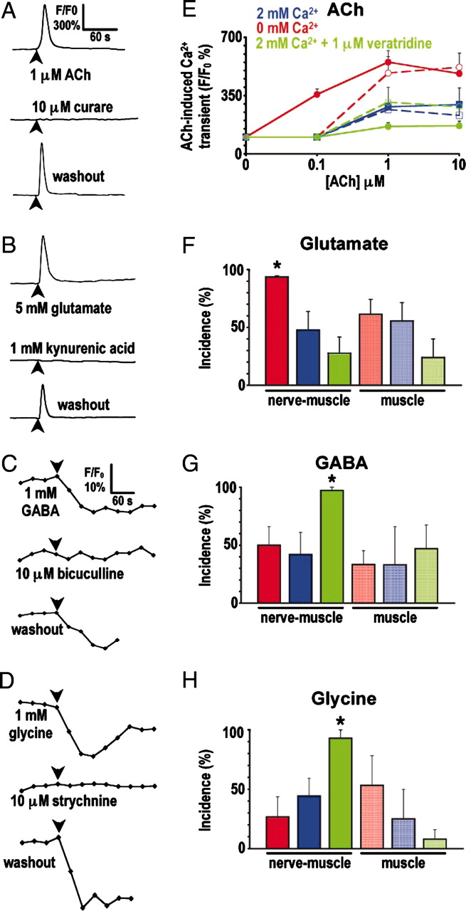 Fig. 4. Sensitivity of uninnervated muscle cells to ACh, glutamate, GABA, and glycine depends on neuronal Ca2+ spike activity in vitro. Muscle cells cocultured with neurons (nerve-muscle) and muscle cells cultured alone (muscle) for 18â24 h were loaded with a fluorescent Ca2+ indicator or Clâ sensor dye to image responses to ACh and glutamate or GABA and glycine, respectively. Imaging was performed in 2 mM Ca2+ culture medium. Glutamate responses were recorded in the presence of 10 μM curare or 3 μM pancuronium to exclude indirect nAChR-mediated responses. (AâD) Traces are responses of uninnervated single muscle cells to neurotransmitters applied at times indicated by arrowheads. (EâH) Analysis of the incidence of responses to transmitters under different culture conditions. â, P < 0.01 when compared with the 2 mM Ca2+ condition for nerve-muscle cultures. (E) Solid lines represent nerve-muscle cultures, and dashed lines represent muscle cultures. Values are mean ± SEM from >40 cells from five independent cultures for each transmitter. |