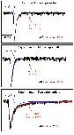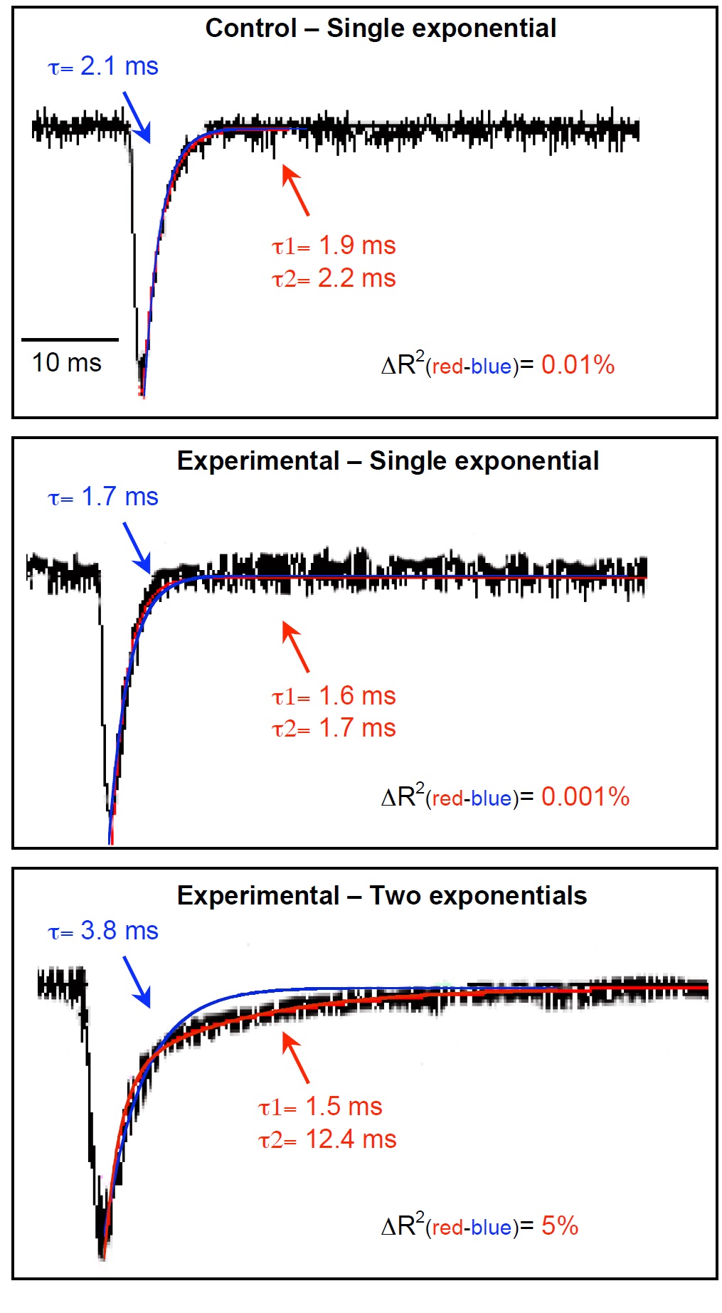 Fig. 6. Fit of mpscs decay times at neuromuscular junctions in vivo. Examples of mpscs taken from recordings (black traces) from control and experimental neuromuscular junctions of stage 40 larvae. Fits of decay times with one exponential (blue trace) and two exponentials (red trace) were performed with the MiniAnalysis Program (Synaptosoft Inc, Decatur, GA). Two exponentials were considered better than one when the change in R2 was >1%. Of the 54 neuromuscular junctions examined in experimental animals, 35 had both monophasic (mean of 82%) and biphasic (mean of 18%) responses, and the rest had monophasic responses alone. Neuromuscular junctions in control embryos did not exhibit biphasic responses. |