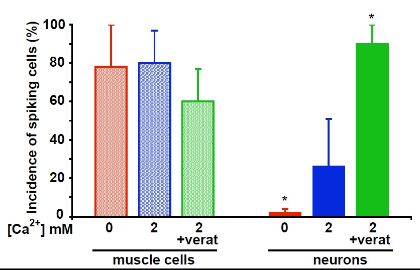 Fig. 7. The incidence of spontaneously generated Ca2+ transients in muscle cells cultured alone or with neurons is unaffected by conditions that alter neuronal Ca2+ spike activity. Cells were loaded with a Ca2+ sensor dye (2 μM Fluo-4AM) at 18-24 h in vitro and imaged at 0.2 Hz. The histograms illustrate the incidence of Ca2+ transients in muscle cells and neurons in Ca2+-free, 2 mM Ca2+, or 2 mM Ca2+ plus 1 μM veratridine medium. There was no difference between muscle cells cultured alone and those cocultured with neurons, and results are presented together. Values are mean ± SEM for >40 cells from five independent cultures for each group. *, P < 0.01 when compared to the 2 mM Ca2+ condition. |