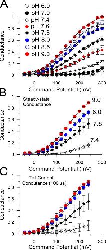 Figure 2. pH dependence of Slo3 macroscopic conductance. In A, steady-state currents were measured from records as in Fig. 1 and converted to conductances. For results from any individual patch, G/V curves were normalized to the maximal conductance observed with pH 9.0. The full set of pH was not tested on all patches, but each point is the mean of 4–18 patches. In B and C, macroscopic conductance was determined both from steady-state currents (B) or tail currents (C) for a set of four patches at pH of 7.4, 7.8, 8.0, and 9.0. For tail current G/Vs a single current value at 100 μs after the nominal onset of the voltage step was used. |