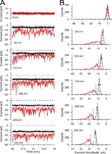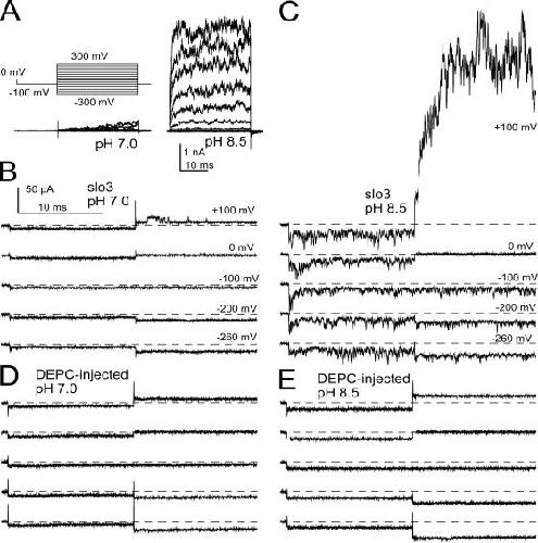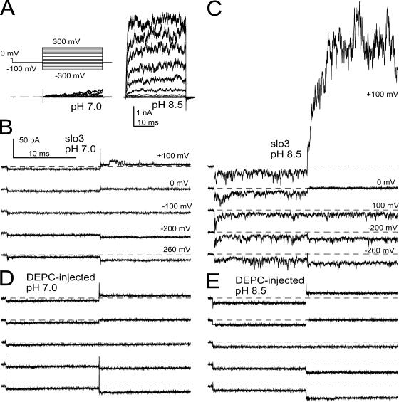 Figure 4. There is appreciable pH-dependent Slo3 current at negative potentials. In A, families of Slo3 currents activated by the indicated voltage protocol are shown for pH 7.0 and 8.5. Test steps to potentials from −300 to +300 mV were preceded by a conditioning step to −100 mV. Each trace corresponds to a single sweep. In B, high gain records for traces in A at negative potentials are displayed on a faster time base showing the absence of channel activity at pH 7.0. In each case, a brief period at 0 mV preceded the step to −100 mV, before the final test step. In C, similar traces at pH 8.5 show increased variance due to channel activity. In D, current traces for the same range of voltages at pH 7.0 are shown for an inside-out patch from an oocyte injected with DEPC. In E, traces are from the same patch as in D, but at pH 8.5, showing that pH increases leak current without any obvious increase in current variance. |