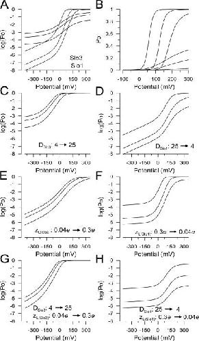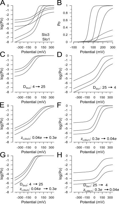Figure 8. The primary differences between the voltage dependence of Slo3 and Slo1 conductance arise from differences in zL and D. In A, predicted log(Po /V) relationships for Slo3 based in parameters in Table I for pH 7.0, 7.6, and 8.5 are shown in red, along with predictions for Slo1 based on values from Horrigan and Aldrich (2002; and Table I) for [Ca2+] of 0.01, 1, and 10 μM. In B, the same relationships are plotted on a linear Po scale. In C, the value of D for Slo3 was changed from 4 to 25 to approximate that for Slo1, resulting in a similar maximal saturating Po at each pH. In D, the value of D for Slo1 was changed from 25 to 4. In E, zL for Slo3 was changed from 0.04 e to 0.3 e to approximate that for Slo1, changing both the limiting slope at negative potentials and the tendency toward saturation at positive potentials. In F, the value of zL for Slo1 was changed to 0.04 e. In G, values for zL and D for Slo3 were simultaneously changed to those describing Slo1, while in H, values for zL and D for Slo1 were changed to those characteristic of Slo3. In both cases, simultaneously changing both zL and D in large measure accounts for the characteristic differences between Slo1 and Slo3. |