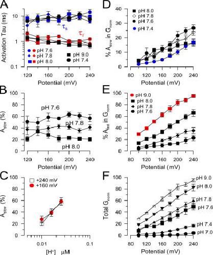 Figure 11. Properties of two components of slo3 activation. In A, fast (red) and slow (blue) time constants of activation at the indicated pH are plotted as a function of activation potential. Error bars are SEM of seven to eight estimates. The single exponential described activation at pH 9.0 closely approximates the fast time constant of activation, while the single exponential describing activation at pH 7.4 approximates the slow time constant. The fast time constant appears to become somewhat faster with depolarization. In B, the percent of the slow activation component is plotted as a function of voltage for three different pH. The relative contribution of the slow component does not change with command potential, but decreases with increases in pH. In C, the percent of the slow component is plotted as a function of pH for two different voltages. The percent of the slow component increases as pH is decreased. At pH 7.4, slow component contribution approaches 100%, while at pH 9.0, it is less than 5%. In D, the absolute contribution of the slow component to normalized conductance is plotted as a function of voltage for different pH. In E, the contribution of the fast component to conductance is plotted as a function of voltage for different pH. All conductance values in D and E were normalized within patches to the maximum conductance observed at pH 9.0. In F, the voltage dependence of the sum of the fast and slow component of conductance is illustrated, approximating the macroscopic steady-state G/Vs. |