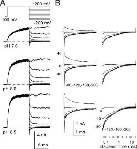 Figure 12. Slo3 deactivation contains two components. In A, the indicated voltage step protocol was used to examine tail current properties at potentials from −200 to +180 at various pH as indicated. Peak tail current at −200 mV is markedly nonohmic in comparison to current at +200 mV. 50 kHz sampling rate; 10 kHz filter. In B, the tail currents in A at potentials from +40 to −200 mV shown on a faster time base to emphasize the fast and slow components of the decay process. Traces on the left are shown on linear time scale, while those on the right are plotted on a logarithmic time scale. |