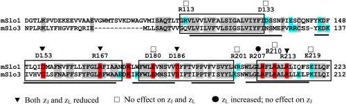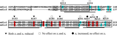 Figure 14. Residues implicated in voltage sensing in mSlo1 are conserved in mSlo3. Alignment compares mSlo1 and mSlo3 sequence from S1–S4. Boxed regions indicate S1–S4 defined by standard hydropathy plots, while black horizontal lines highlight putative α-helical segments defined from structural analysis (Jiang et al., 2003). Charged residues highlighted in red are identical between Slo1 and Slo3, while other identical residues are shaded in gray. Charged residues that are not conserved are highlighted in blue. All residues shown to influence both zJ and zL in Slo1 (Ma et al., 2006) are conserved between Slo1 and Slo3 (▾). A number of charged Slo1 residues shown to have no effect on either zJ or zL (□) are not strictly conserved in Slo3, while mutation of R207 has novel effects on zL. |