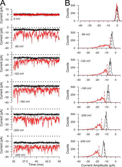 Figure 5. Evaluation of the average Slo3 current magnitude at negative potentials. In A, segments of currents obtained at either pH 7.0 or pH 8.5 are compared over a range of voltages for the patch shown in Fig. 4. Dotted line corresponds to the zero current level, and the dashed line corresponds to a baseline that reflects a leak conductance that is voltage independent over this range of voltages. The baseline level was chosen so that the range of current levels positive to this baseline was similar to the variance observed around the baseline for currents at pH 7.0. In B, total amplitude histograms for traces at pH 7.0 and pH 8.5 are shown, with vertical lines corresponding to the baseline used in the two cases. Note the asymmetry in the traces at pH 8.5 and symmetry at pH 7.0. The Slo3 conductance at negative potentials was estimated based on the integral of current values in the distributions at pH 8.5, after baseline subtraction. |