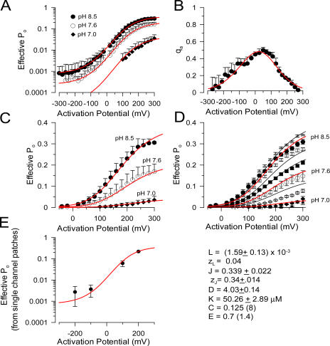Figure 7. Slo3 steady-state conductance can be described by Scheme 1. In A, the log(Po) vs. voltage relationships at pH 7.0, 7.6, and 8.5 were fit (red line) with Scheme 1, assuming zL = 0.04, and constraining C and E. Macroscopic conductances were converted to Po based on the estimates of unitary current Po in the accompanying paper (Zhang et al., 2006). In B, qa, the mean activation charge displacement, was determined from the slope of the log(Po) vs. V relationship. Each qa estimate was determined from the slope of the log(Po) vs. V values for each sequential set of four voltages, covering a 60-mV range. Error bars correspond to the confidence limit on the fit to the slopes. The red line corresponds to the expected qa/V relationship based on the fit shown in A. In C, the data in A were replotted on a linear scale to show the adequacy of the fit at higher Po values. In D, the predictions of the allosteric derived from the fit shown in A are compared with the Po vs. V relationship shown in Fig. 2 for a different set of patches in which currents were measured over a wider range of pH. Red lines correspond to pH 7.0, 7.6, and pH 8.5, respectively, with solid symbols reflecting those concentrations. In E, estimates of the voltage dependence of single channel Po provided in the accompanying paper (Zhang et al., 2006) show good agreement with the expectations derived from fitting A. |