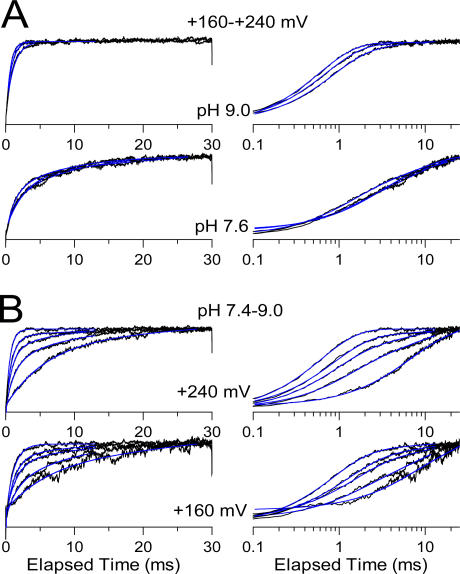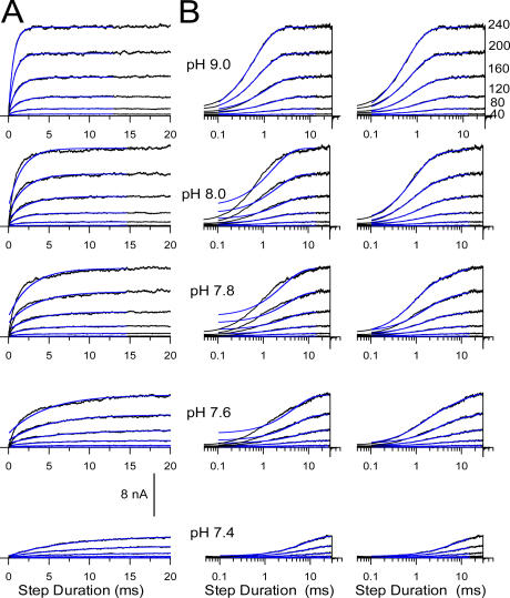 Figure 9. Slo3 activation time course is defined by two exponential components. In A, the Slo3 activation time course is illustrated for pH from 9.0 to 7.4 (top to bottom) at voltages from +40 to +240 mV. Blue lines indicate single exponential fits (I(t) = Aexp(−t/τ) + C)) to the activation time course, which at pH 7.6, 7.8, and 8.0 fails to describe the activation time course. In B, the same traces are shown on a logarithmic time axes along with either a single exponential (left traces) or a two exponential (I(t) = Asexp(−t/τs) + Afexp(−t/τf) + C; right traces) fit to the activation time course. The activation time course is best described by two exponential components. |