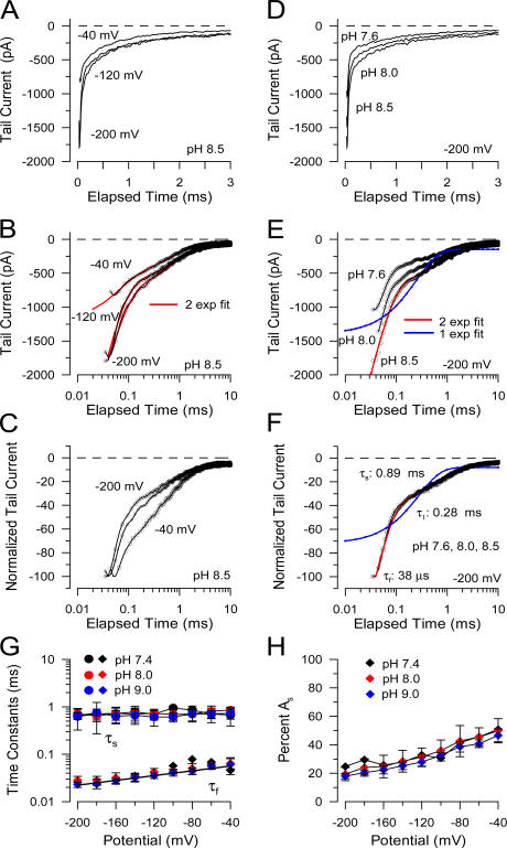 Figure 13. Dependence of deactivation on voltage and pH. In A, tail currents at pH 8.5 are shown on a linear time scale for −40, −120, and −200 mV. In B, traces from A are shown on a logarithmic time scale along with a two component exponential fit (red lines) to the decay process. In C, tail currents from B were normalized to their maximum amplitude to illustrate the decrease in the relative amplitude of the slow exponential component at more negative potentials. In D, tail currents at −200 mV are compared for pH 7.6, 8.0, and 8.5. In E, the traces in D are plotted on a logarithmic time scale. For the example at pH 8.5, the best fit of a single exponential function (blue line) and a two component exponential function (red line) are compared. Time constant for the single exponential fit was 0.28 ms, while for the two component fit, τf = 38 μs and τs = 0.89 ms. In F, normalized tail currents at −200 mV, but at different pH, show a similar time course. Fits are as in E. In G, slow (τs) and fast (τf) time constants from tail currents are plotted as a function of potential for pH 7.4, 8.0, and 9.0. For τf, the line corresponds to τf(V) = τf(0)exp(zV/kT), where τf(0) = 0.071 ± 0.004 μs and z = 0.147 ± 0.01 e. In H, the voltage dependence of the contribution (percent) of the slow component to the tail current is shown for pH 7.4, 8.0, and 9.0. |