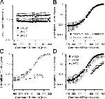 Figure 3. Empirical properties of Slo3 G/V curves. In A, the voltage of half activation (Vh) is plotted as a function of proton concentration. Vh estimates were based on Boltzmann fits (Eq. 1) in which Gmax was not constrained. In B, Gmax obtained from fits of Eq. 1 to G/V curves at each pH are plotted as a function of [H+]. The solid line is a fit of Hill equation (G([H+]) = Gmax/{1 + ([H+]/Kd)n}), yielding an effective Kd of 23.3 ± 2.9 nM and with n = 1.9 ± 0.4. In C, the normalized conductance is plotted as a function of [H+] for a range of command potentials. Solid lines show the best fit of a similar Hill function to conductance estimates at each voltage. The range of estimates for Kd was 15–21 nM corresponding to pH of 7.7–7.8, with minimal voltage dependence in the estimates. Estimates of n ranged from 1.9 to 2.2. |