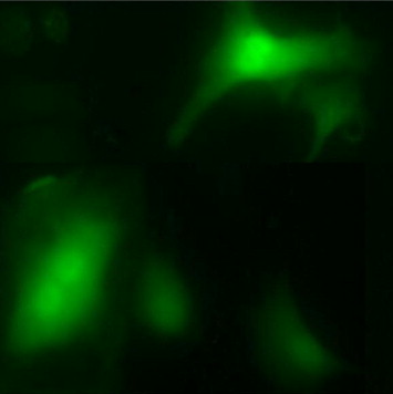 Cellular localization of the xDRR 1 protein. The A549 cells were transfected with expression vector pEGFP-N1/xDRR1, which expresses a fusion protein consisting of DRR 1 and EGFP epitope, and then detected under fluorescence microscope (×200). Included in the picture are cells which show the fusion protein (strong green) in nuclei. (For interpretation of the references to colors in this figure legend, the reader is referred to the web version of this article.