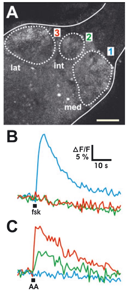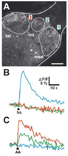 forskolin. (A) Fluo-4-stained OB of a nose–brain preparation (image acquired