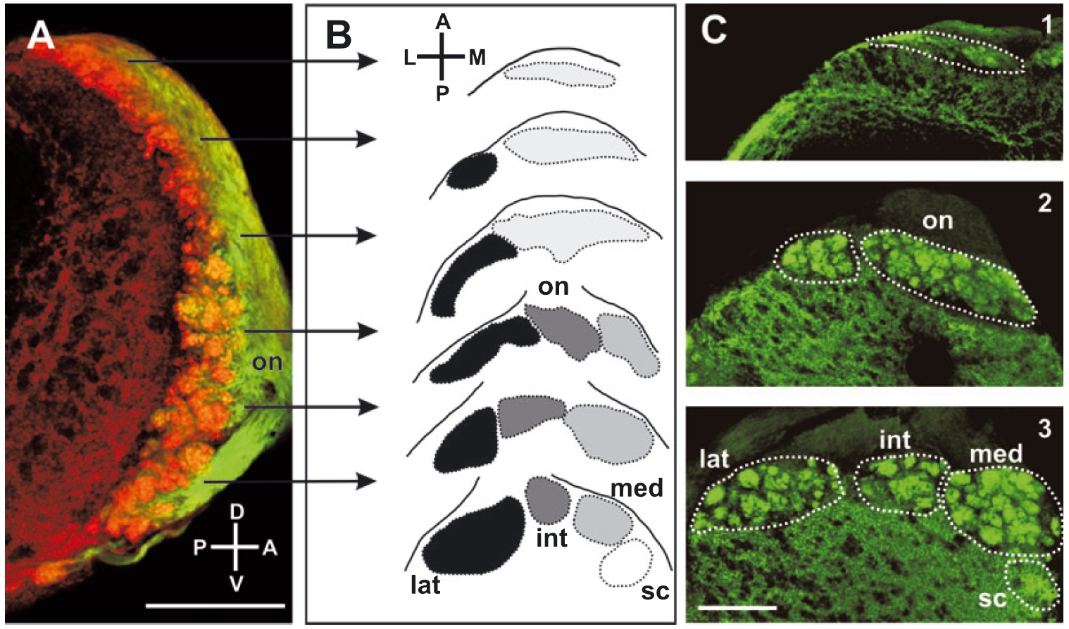 Fig. 1. Glomerular distribution in the MOB of larval Xenopus laevis. (A) Sagittal section of the MOB double-labelled with synaptophysin immunostaining (red) and anterograde labelling with biocytin through the olfactory nerve (green; on, olfactory nerve). The axes indicate: A, anterior; P, posterior; D, dorsal; V, ventral. (B) Schematic representation of the glomerular distribution in the MOB. The axes indicate: A, anterior; P, posterior; L, lateral; M, medial. Glomerular clusters: int, intermediate glomerular cluster; lat, lateral glomerular cluster; med, medial glomerular cluster; sc, small glomerular cluster. (C) Horizontal view of synaptophysin immunolabelled sections of the anterior part of the MOB at three different heights (C1, dorsal OB; C2, intermediate OB; C3, ventral OB). Scale bars: 100 lm.