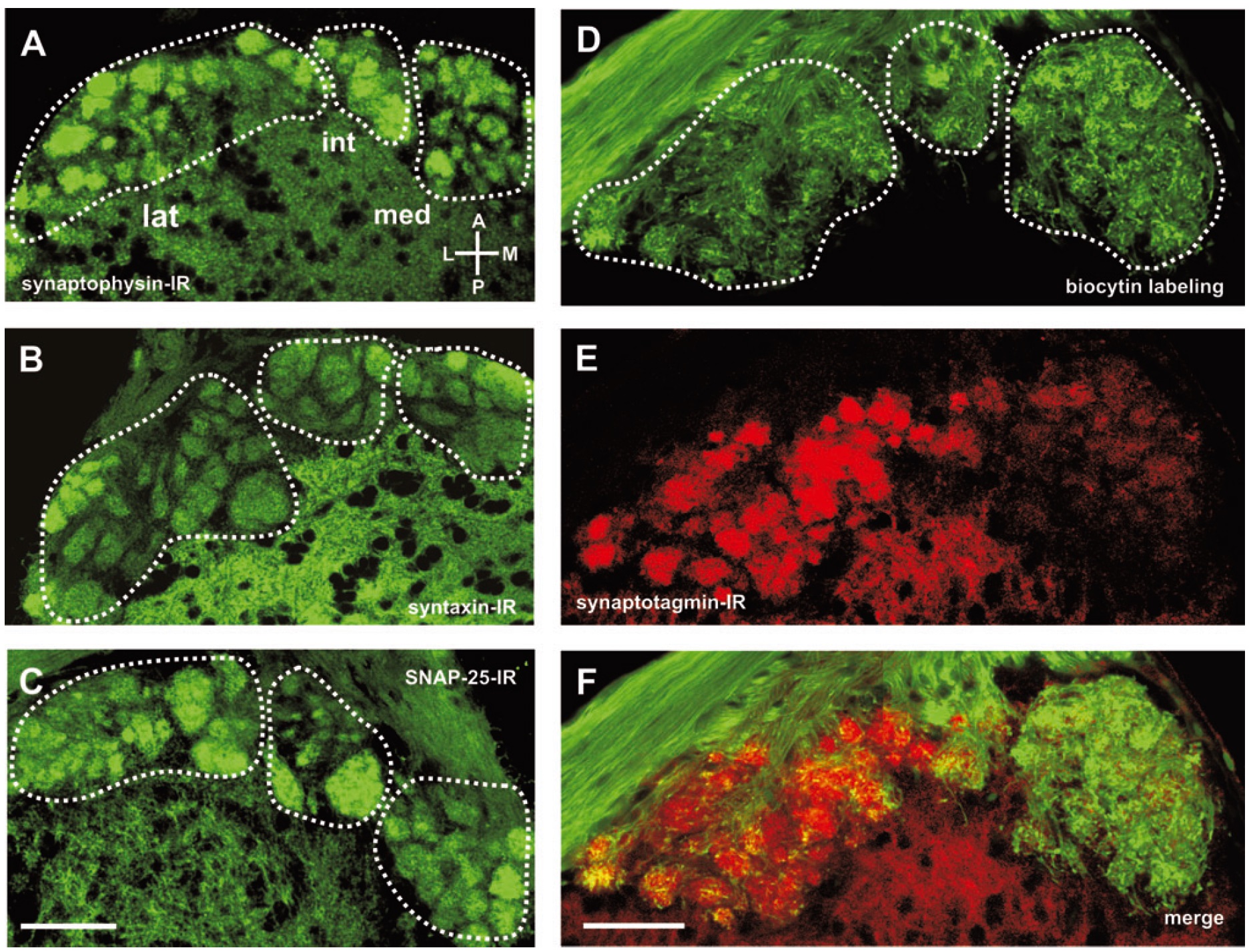 visualizes three glomerular clusters. (E) Synaptotagmin immunostaining of the same slice shown in (D). Synaptotagmin-immunoreactivity (IR) was limited to the lateral and partly to the intermediate glomerular