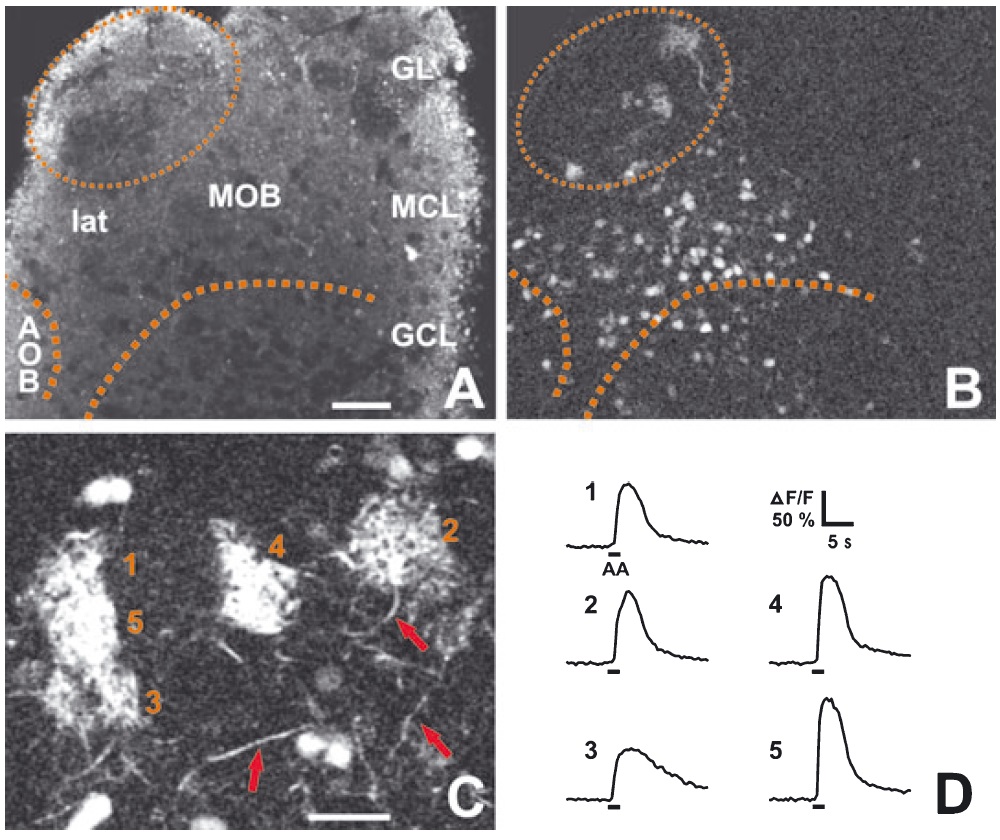 Fig. 3. Noseâbrain preparation and amino acid-induced calcium signals in individual glomeruli in the lateral glomerular cluster of the MOB. (A) Fluo-4-stained OB of a noseâbrain preparation. The dotted lines indicate the approximate borders of the accessory OB and the mitral and granule cell layer in the MOB and